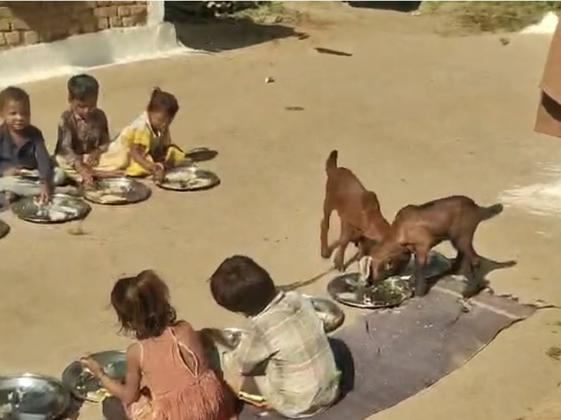 The viral video shows young children sitting on the floor and eating their midday meal, while goats are seen feeding from plates kept next to them and consuming the same food. Neither the anganwadi worker nor the helper can be seen in the footage, raising serious concerns about supervision and hygiene.